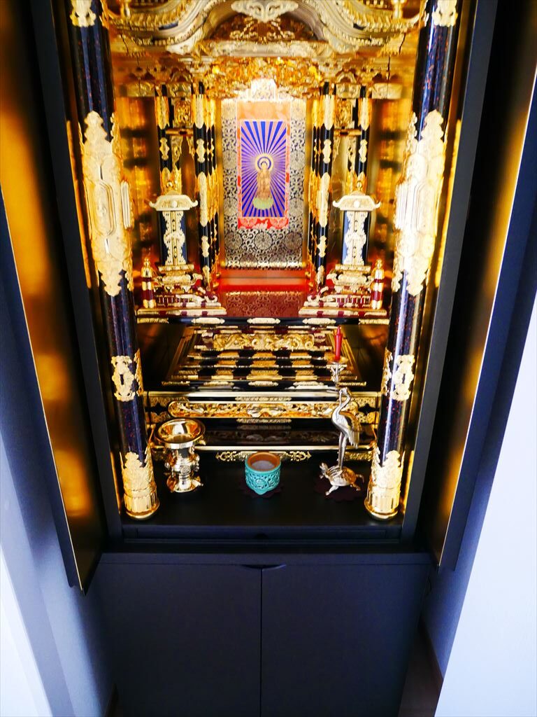 お仏壇は、昔ながらの背の高い金仏壇で、幅・高さともにマンションのリビングには少し大きめ。